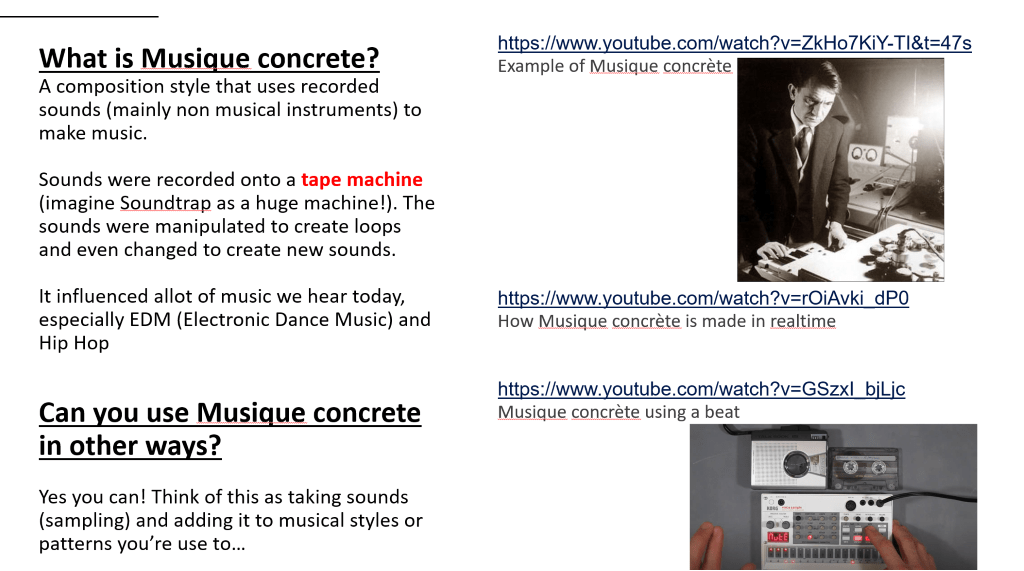 Figure 3: Screenshot taken from lesson 1 ‘Making music using Recorded Sounds’ PowerPoint. This refers to Contextualising Concrete being an acceptable composition method, links and fusions with other genres that use the methods.