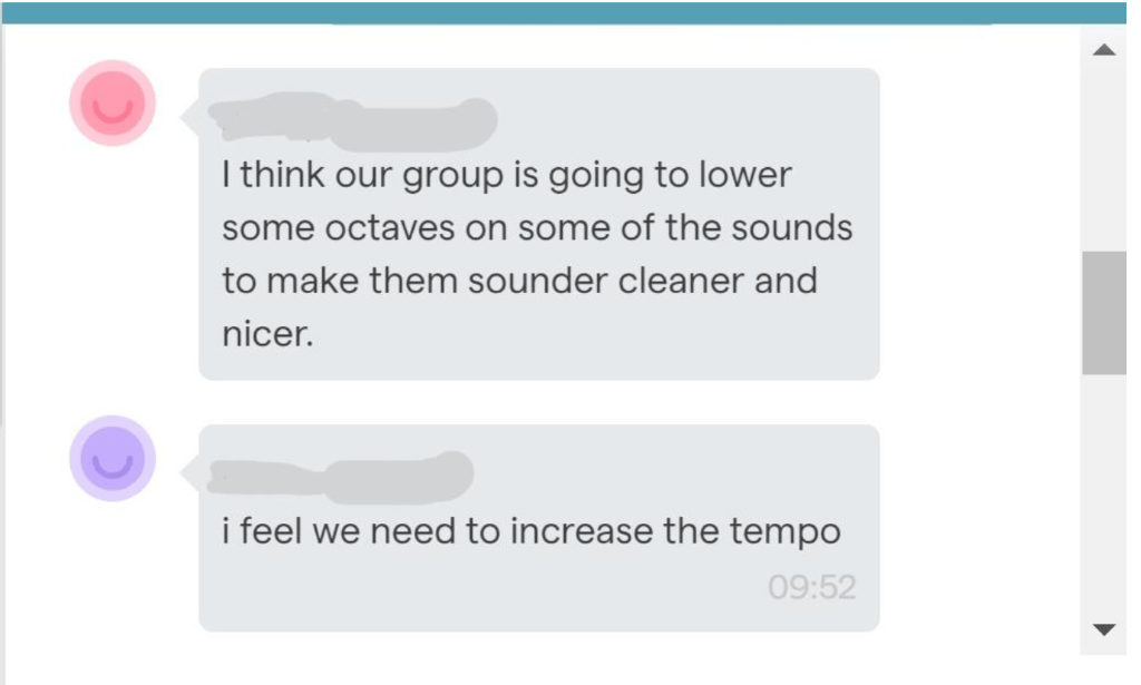 Groups posted their assignments onto Teams and after playing their pieces to the class, engaged in a teacher-led discussion about it, if students felt shy or uncomfortable speaking, then they were permitted to post a comment in the ‘General’ chat. The benefit of this peer feedback was that it allowed students to hear each other’s work and allowed them to talk about the creative experience as part of a discussion (experiential). Some students did not engage with this process, and in a real classroom setting it would have been easy to initiate a response, in the remote classroom setting, however, directly asking a student for their views proved challenging as they could ignore the question and switch/mute themselves. There was then, a balancing act in being aware of class interaction with each other and interact with the teacher, making sure to respect boundaries when students communicated in chat boxes with each other but making them feel like the lesson was monitored (Johnson & Lamothe, 2018).
